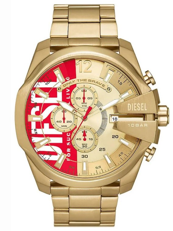 Zegarek męski Diesel Mega Chief DZ4642 napędza japoński mechanizm kwarcowy, zasilany baterią o średniej żywotności 2 lat. Wyróżniający się cyferblat czasomierza w kolorach złota i czerwieni, zabezpiecza bardzo odporne na zarysowania szkiełko mineralnym. Kopertę i bransoletę wykonano ze stali szlachetnej w kolorze złotym, co gwarantuje wieloletnią trwałość.
